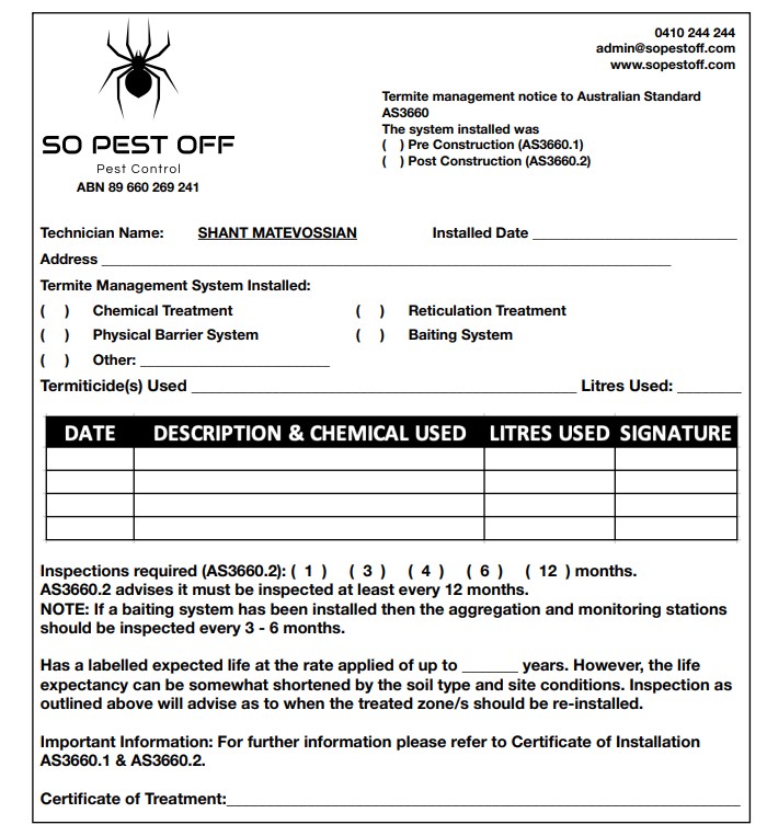 - A certificate detailing the installed termite management system